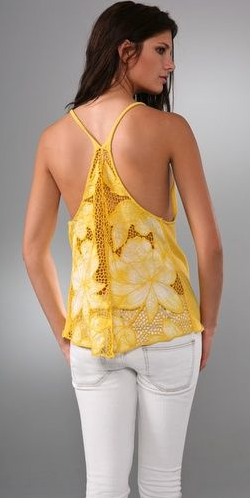 Sorry for the excessive amnt of pictures here, but this is one of those things that surprised me w/how diff it looks in diff pics. The first ones, obv shopbop (via some Ebay listing) looks all perfectly draped, and the middle ones (Piperlime) look perfectly silky, but then you look at the last couple, and realize that it's far rougher than it originally appeared, and falls/drapes possibly a little weirdly. I've been seeing/sort of wanting this on Ebay for a while, but it's always been way too much for basically a tank (plus it's a lil sheer, so I'm not sure how wearable it is). It is still too much on Ebay, but now on Piperlime w/the discount, I think it's a reasonable price. There's one listing on Ebay for this but in a pale turquoise that's actually really pretty too, and $19.00 (w/one bid currently, buyitnow for $39.99, ending at 6:30pm PST on 12/20), but I'm relatively sure it will go for higher than the yellow on Piperlime. Plus shipping is $4 for that one. So yah. Plus it is called the Golden Gate top! I still wish it were under $20 though, so iono...